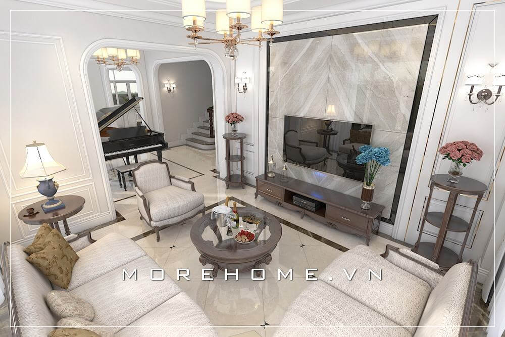 Thiết kế nội thất phòng khách biệt thự, nhà phố với tone màu trắng hiện đại và đồ nội thất thiết kế sang trọng, đẹp mắt ấn tượng