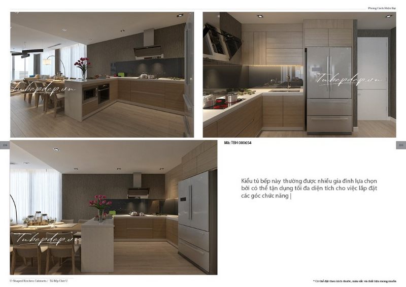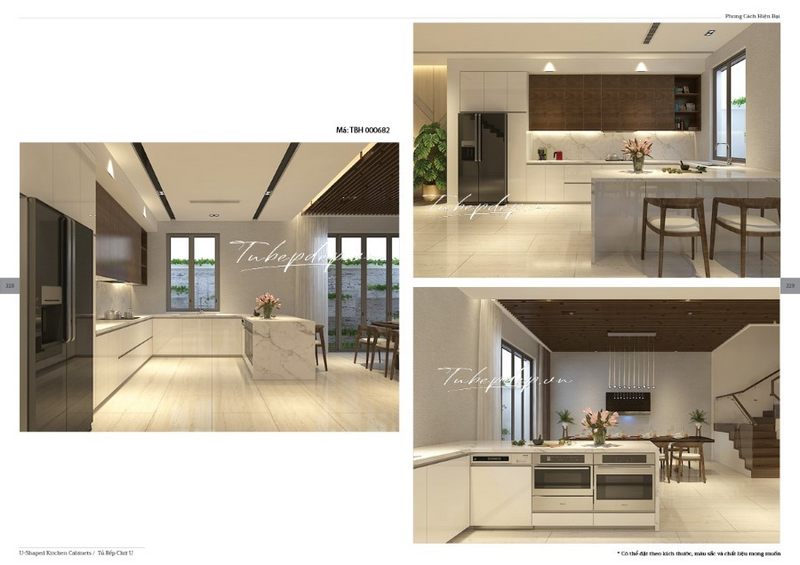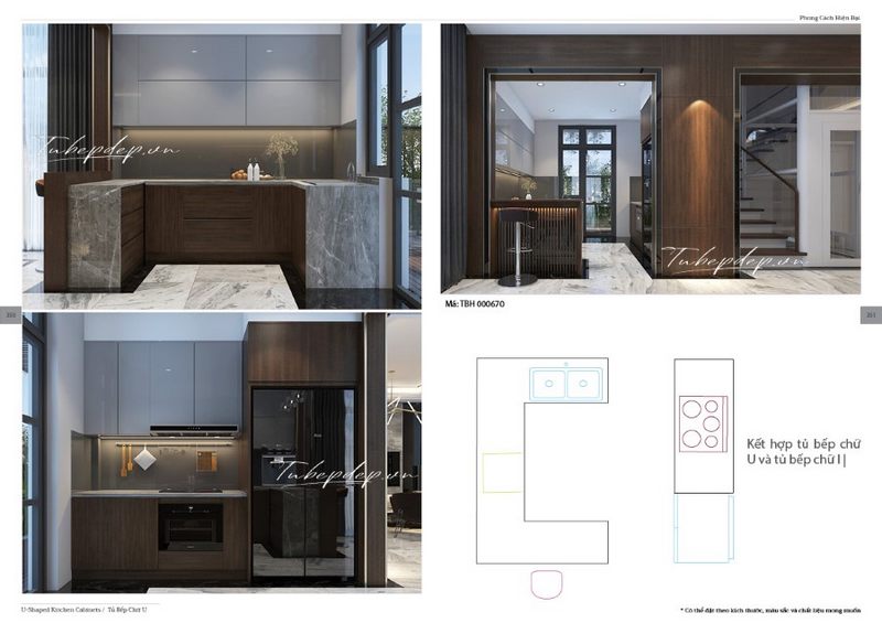 Mẫu thiết kế phòng bếp biệt thự, nhà phố hiện đại kết hợp tủ bếp chữ U và chữ I thông minh, tiết kiệm không gian.